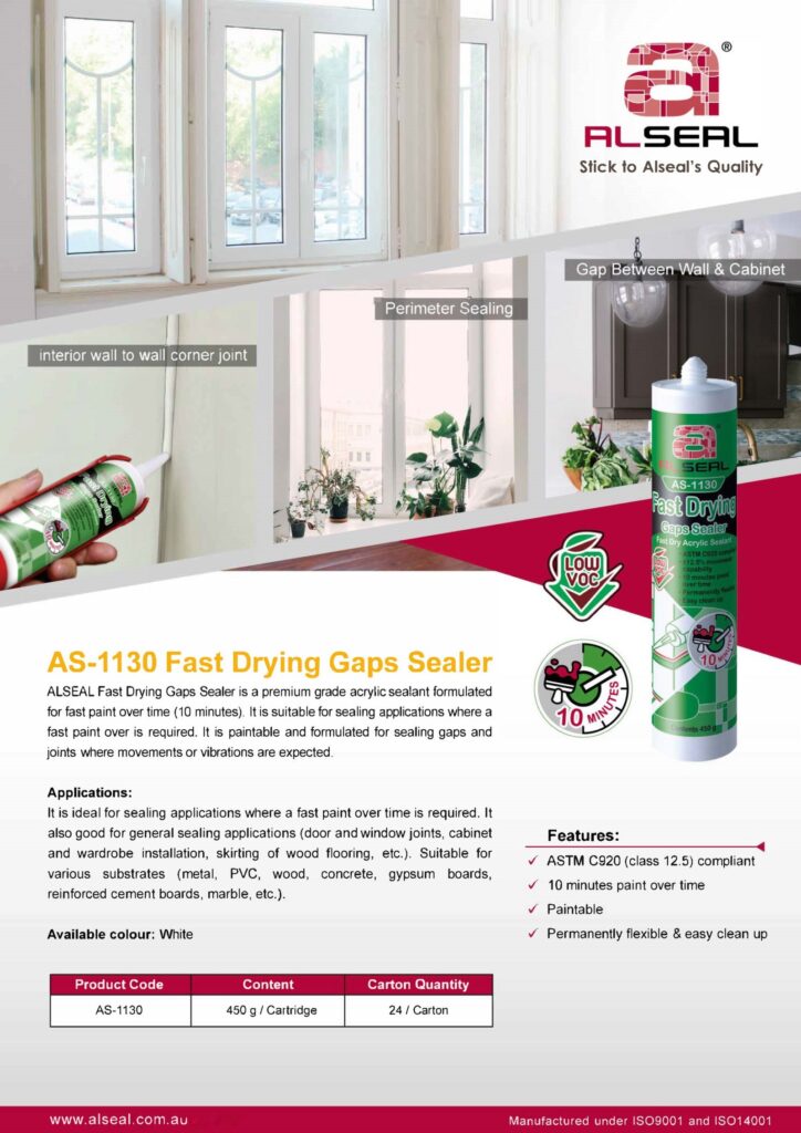 Fast Drying Gaps Sealer AS-1130 is a premium grade acrylic sealant formulated for fast paint over time (10 minutes). It is suitable for sealing applications where fast paint over is required. The Sealer is paintable and formulated for sealing gaps and joints where movements or vibrations are expected.